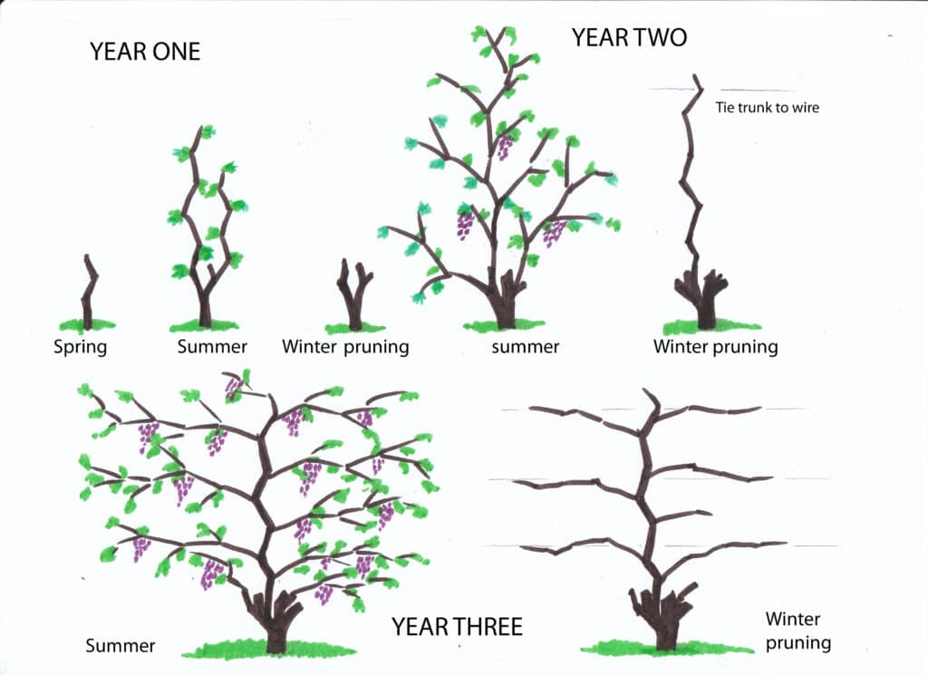 The diagram above (by Urban Wine Grower) shows how professionals prune a grape vine over its first three years. It looks catastrophic to cut the growth back so severely. But consistent, deep pruning leads to vines that produce sixteen times as much fruit as unpruned vines!